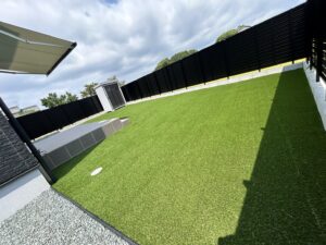 裏庭スペースにタイルデッキ・オーニング・人工芝 を設置し、使い勝手とデザイン性を両立したお庭へと仕上げています。