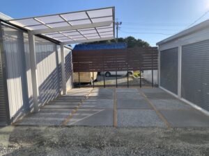 カーポート設置、エコモックフェンス、洗い出し仕上げ、土間コンクリート工事を行っております。